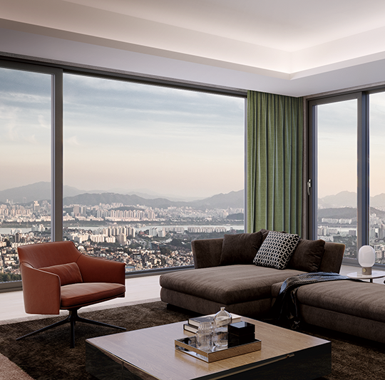 철제 난간대 대신 투명한 유리난간대로 넓고 시원한 조망권 제공