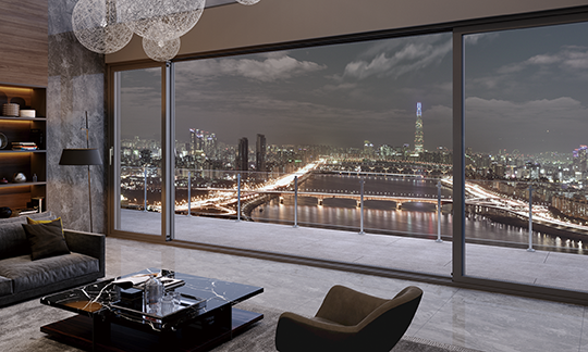 동시에 유리난간대 적용으로 거주자에게 넓은 시야까지 제공하는 고급 시스템 창호입니다.
